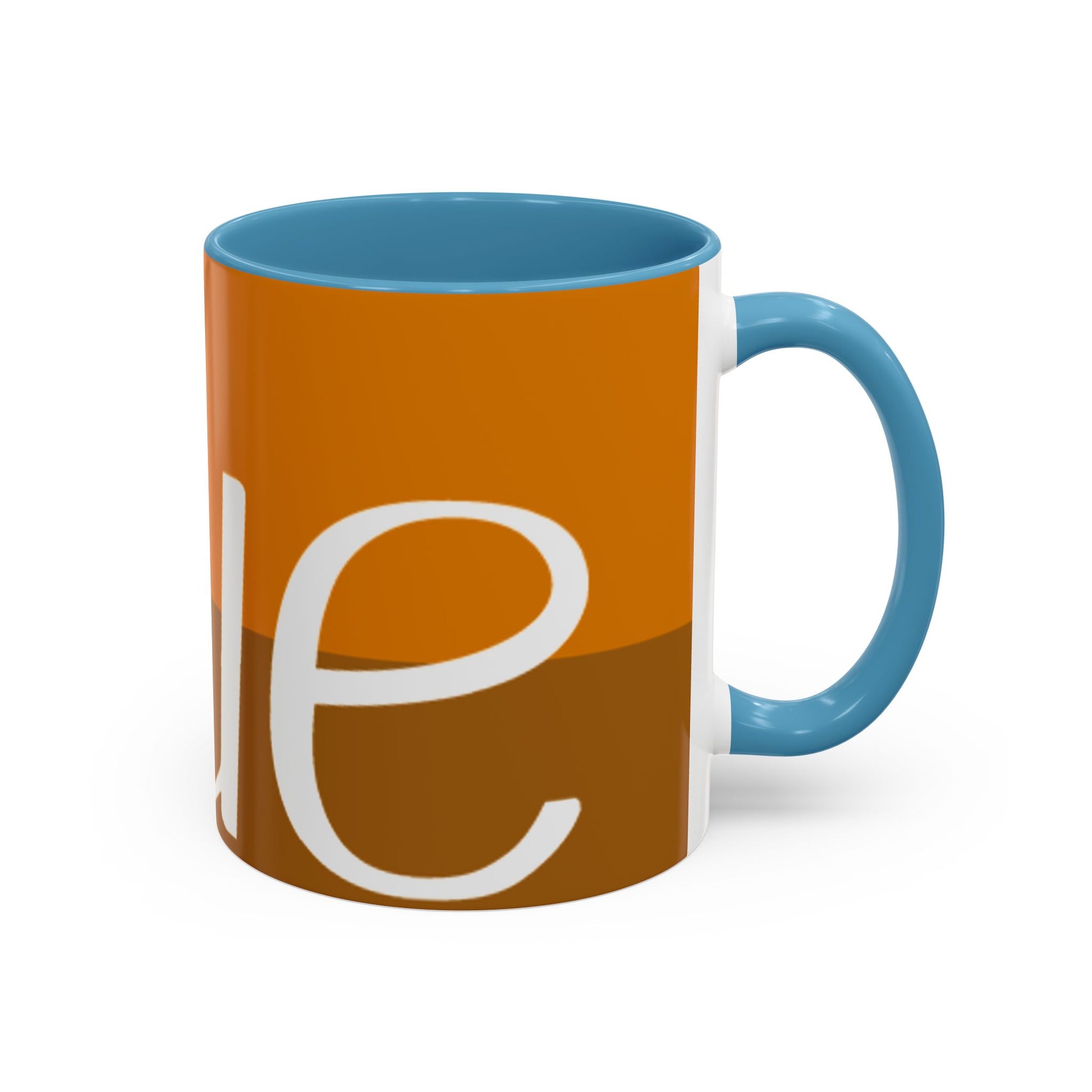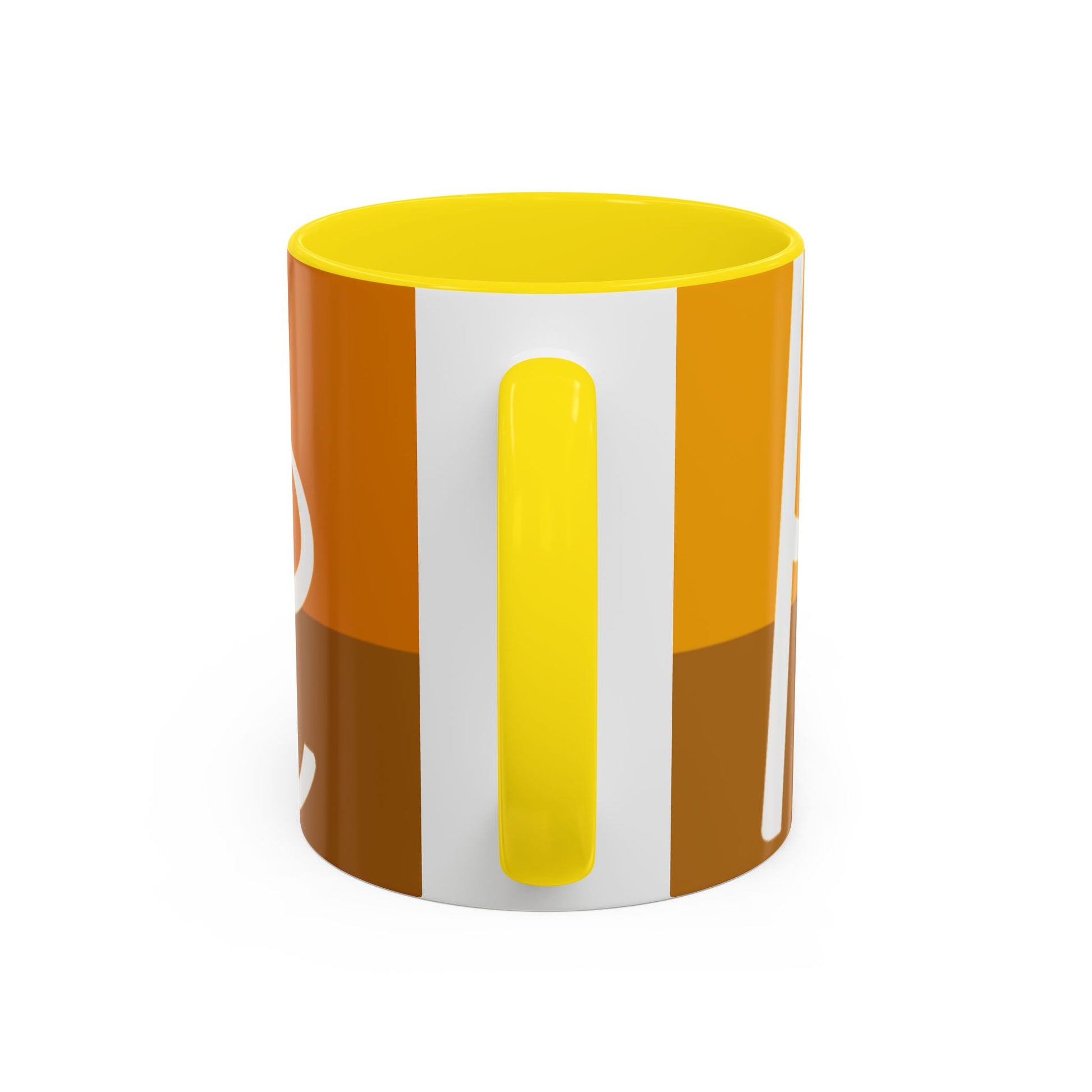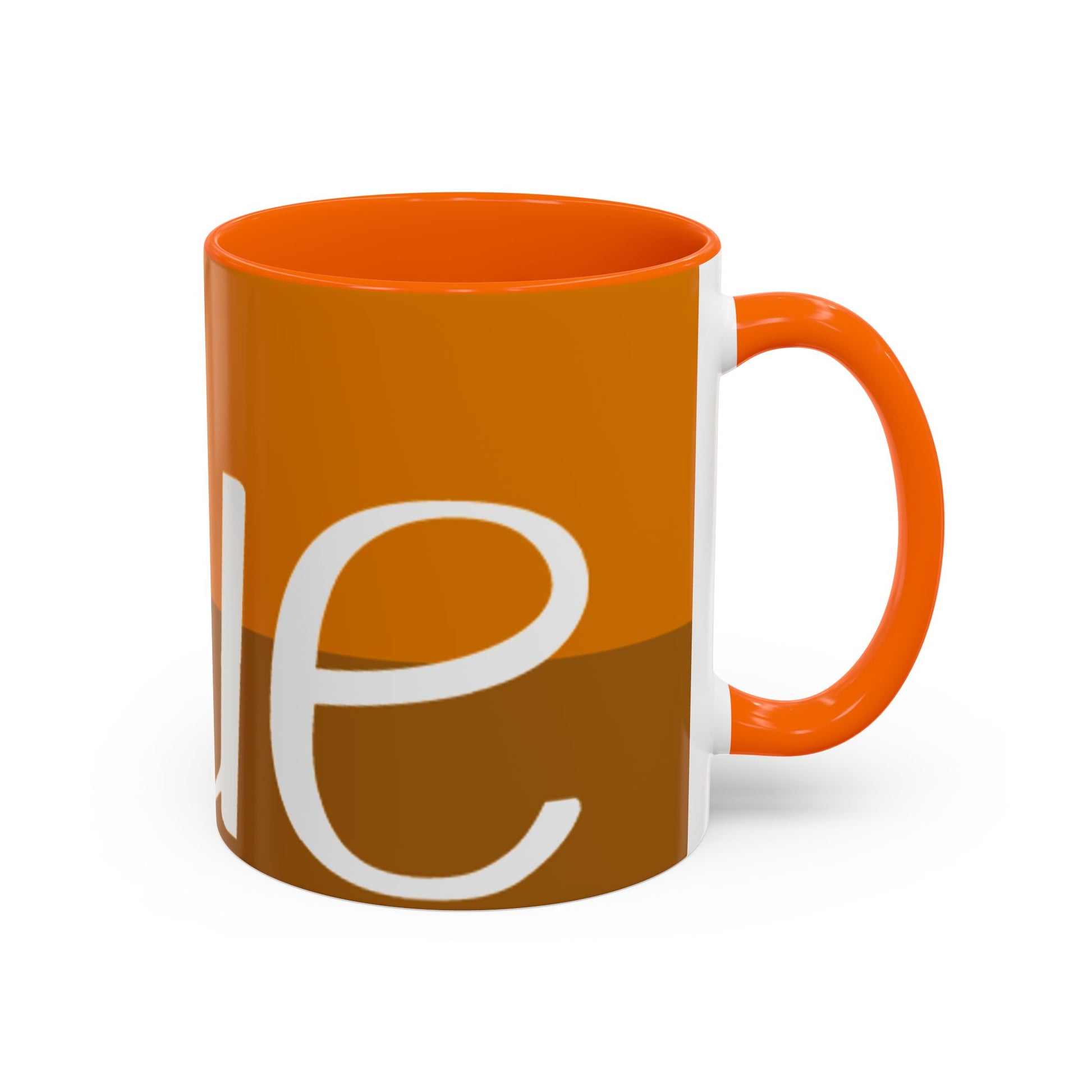 - White ceramic body with colored interior and C-shaped handle and glossy finish