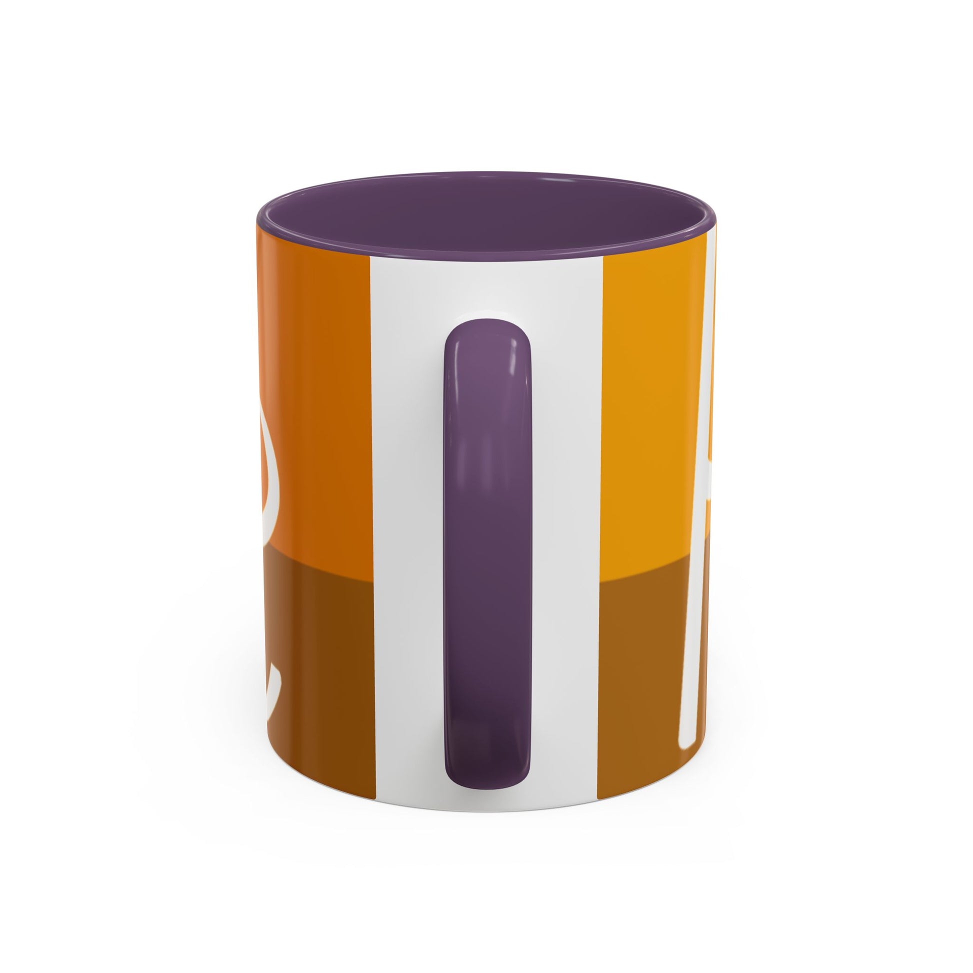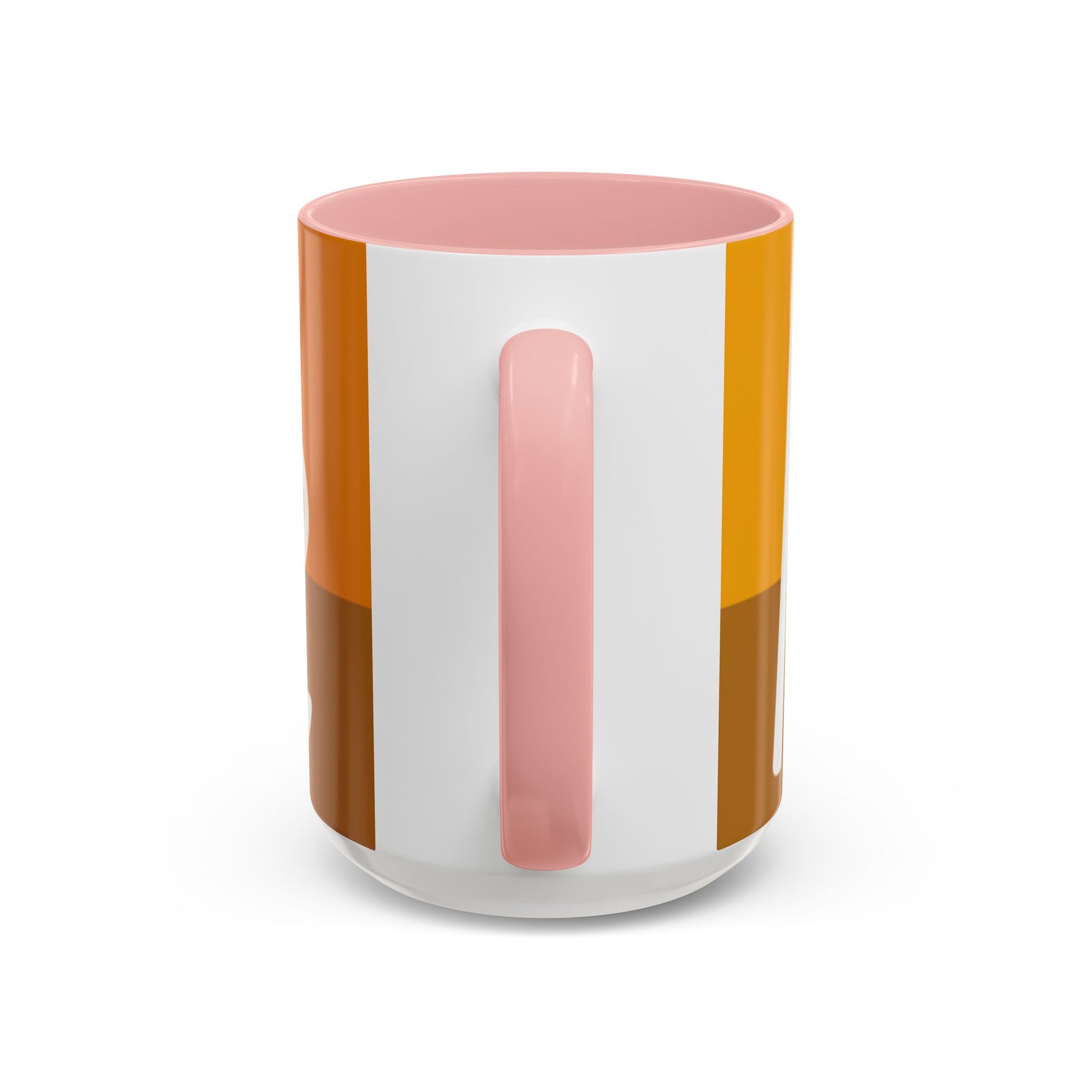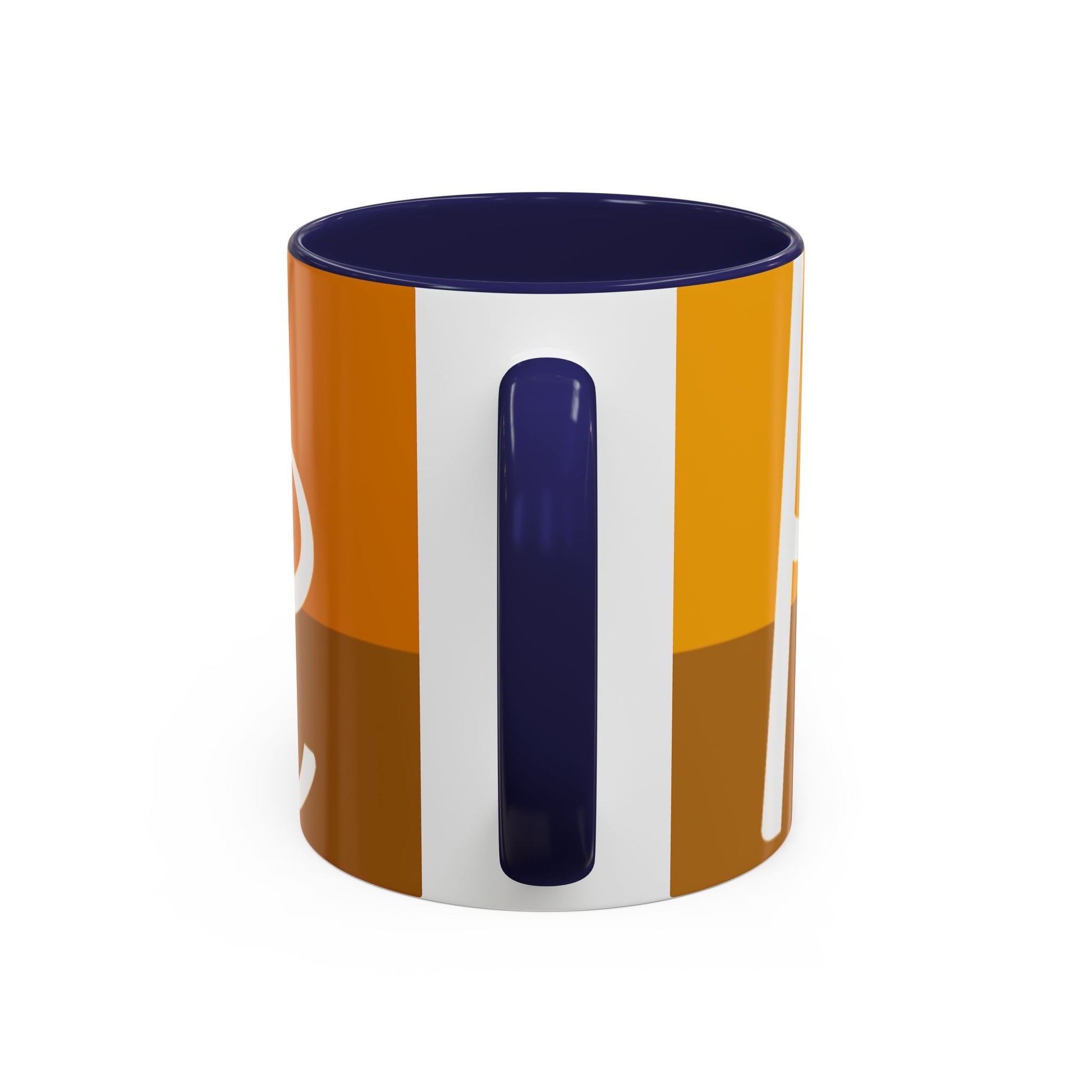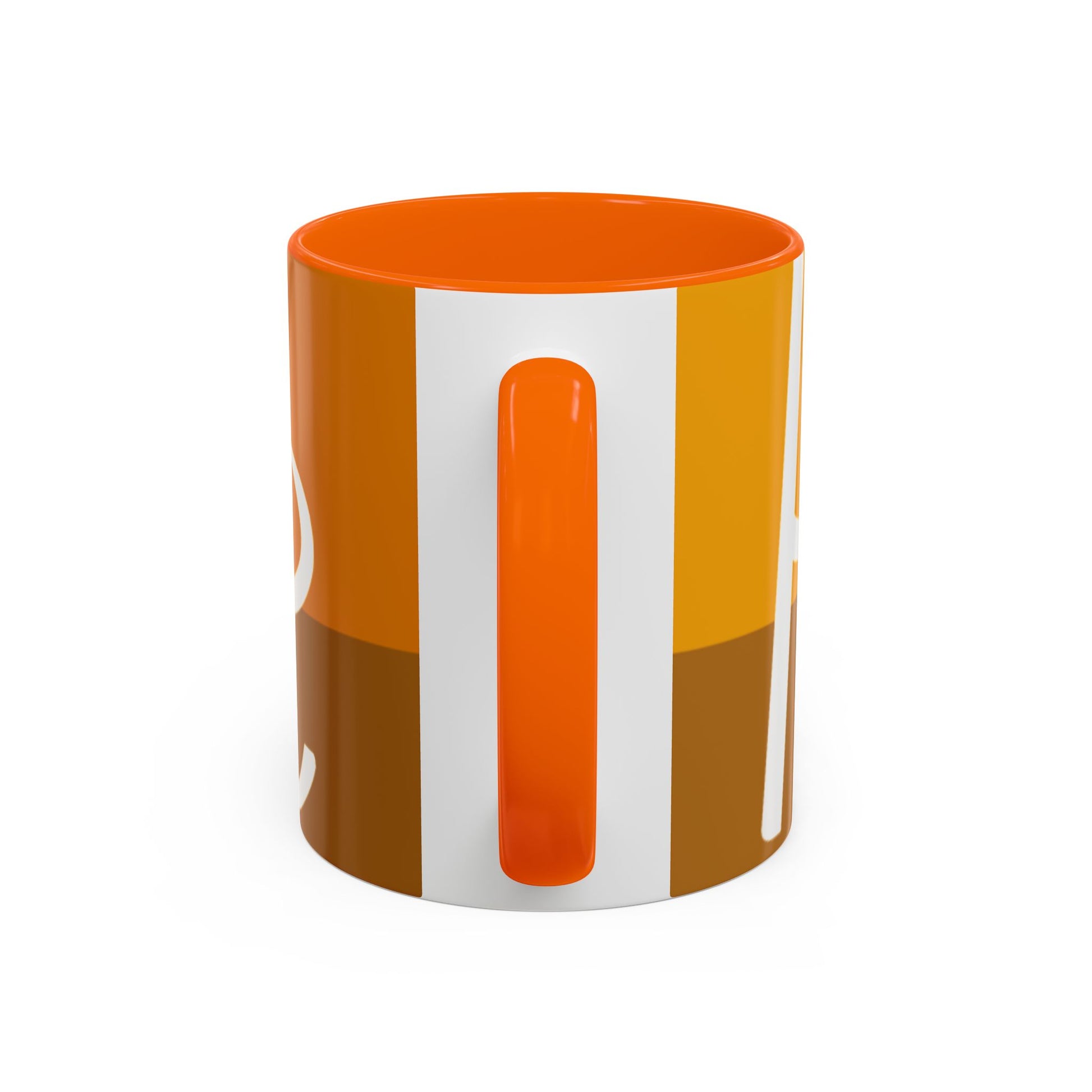 - White ceramic body with colored interior and C-shaped handle and glossy finish